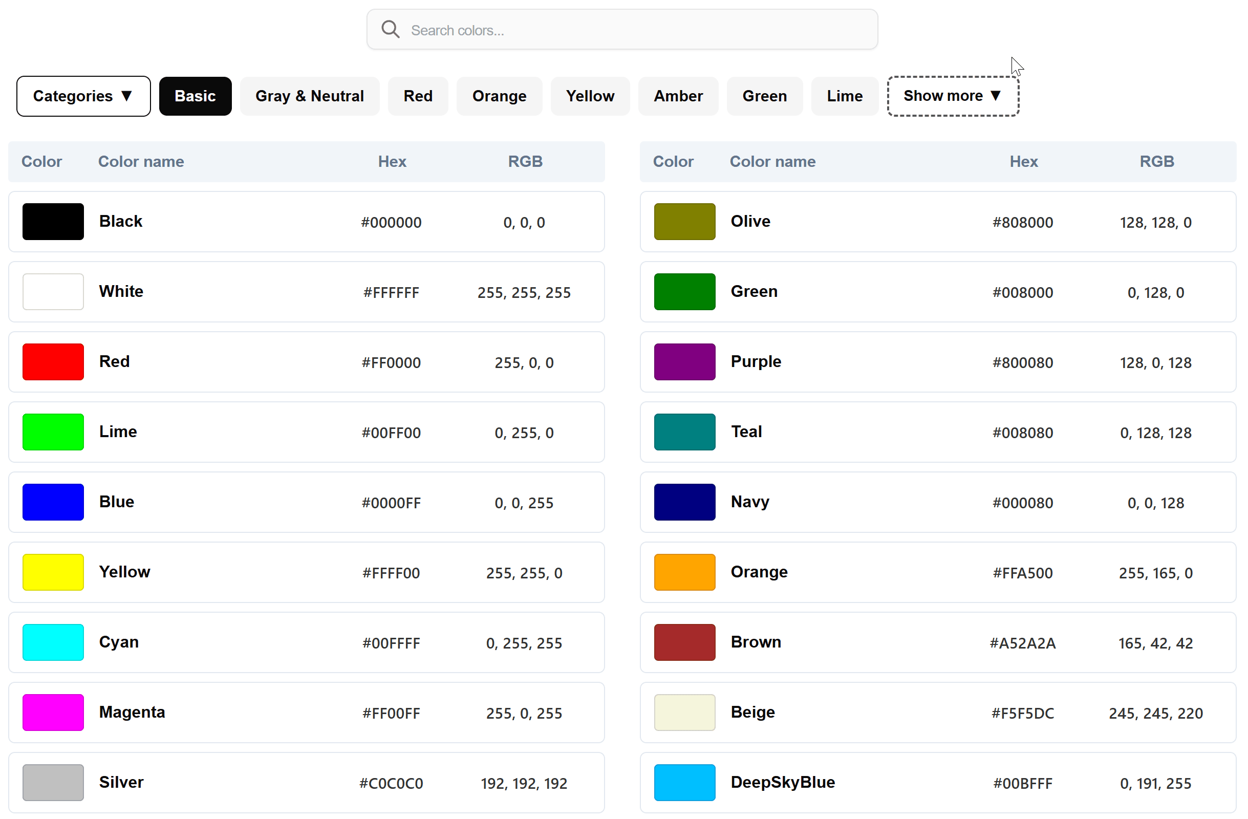 Use the search box to look up a color by name, Hex value, or RGB value. This makes the tool useful when you already know part of a color code and want to find the exact match quickly.