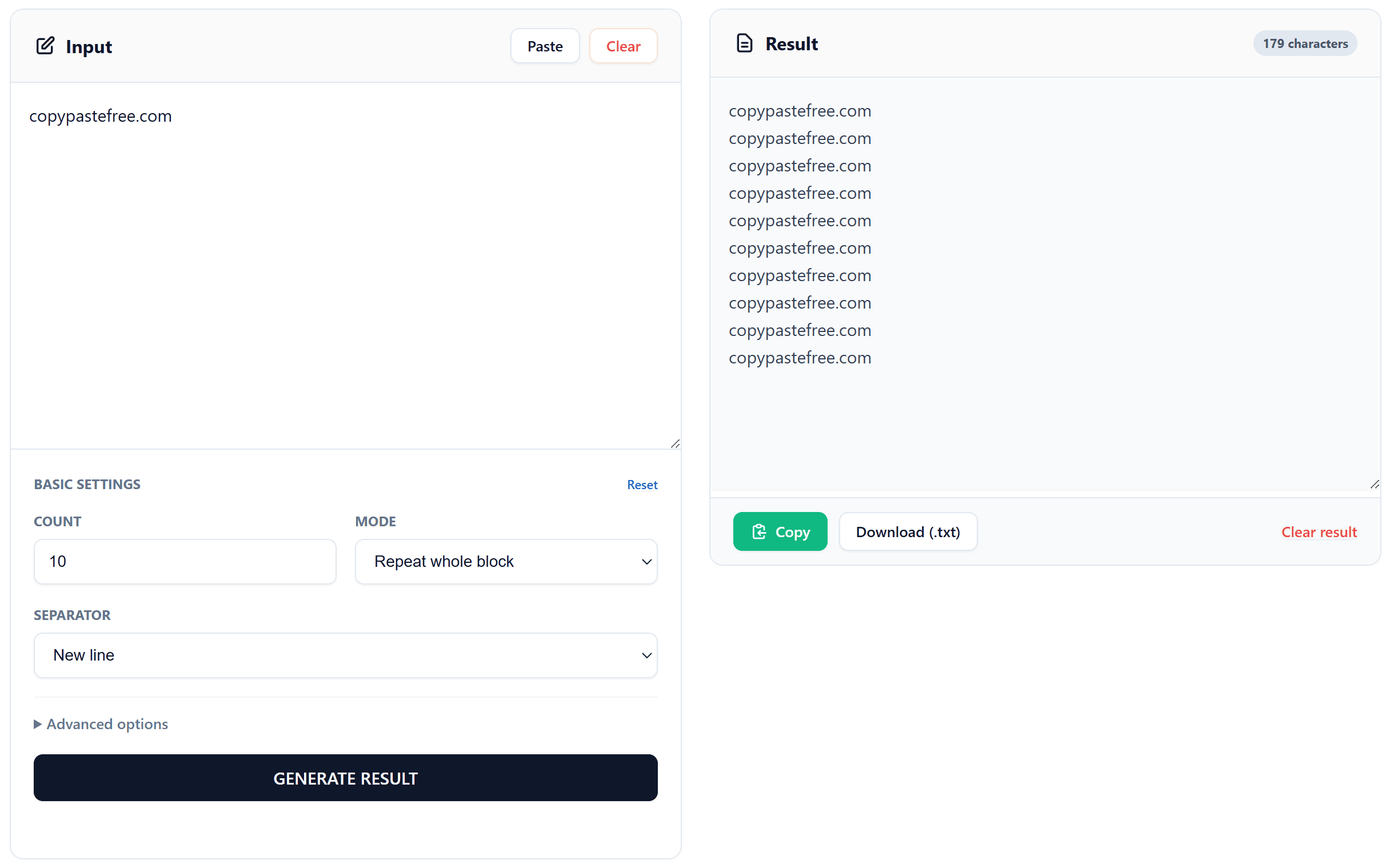 Simply type or paste the content you want to multiply into the input field on the left. You can use single words, sentences, or even complex blocks of code.