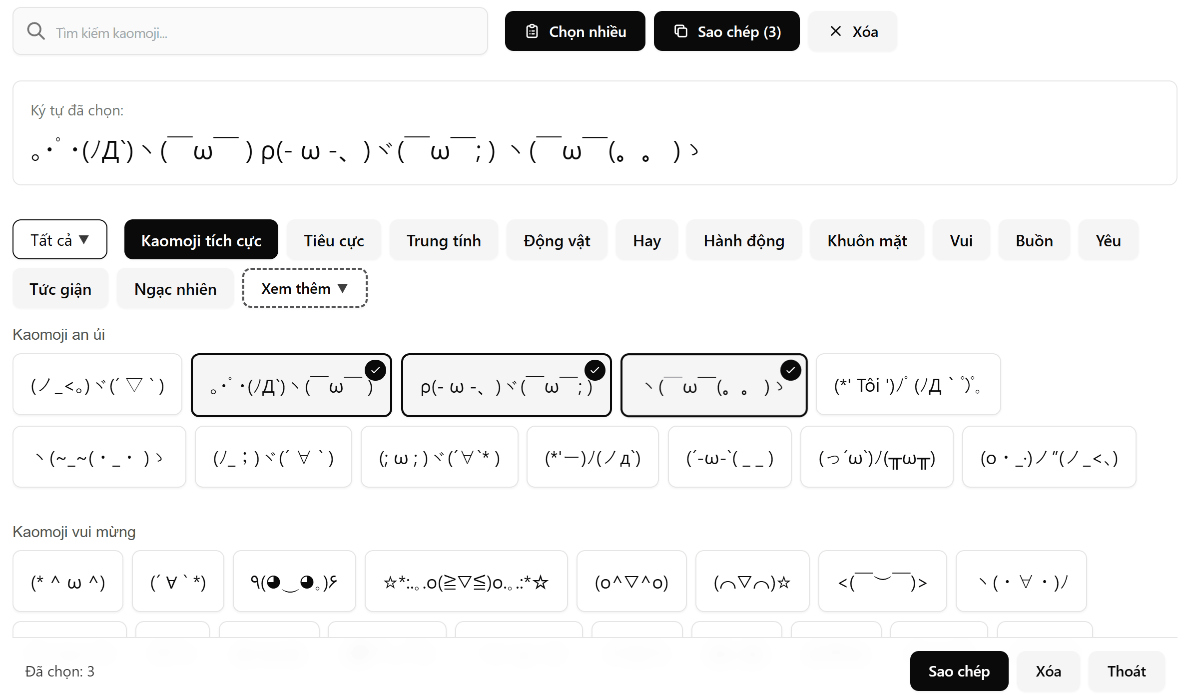 Nhấp vào Kaomoji bạn thích để sao chép ngay (chế độ đơn) hoặc bật “Chọn nhiều” để gom nhóm nhiều ký tự.